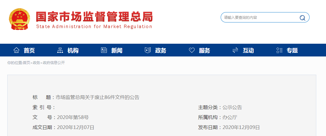 為適應改革和經濟社會發展要求,經商國務院有關部門,決定廢止《工商總局辦公廳關于進一步規范總局機關政府信息公開工作的意見》等86件文件,現予以公告。