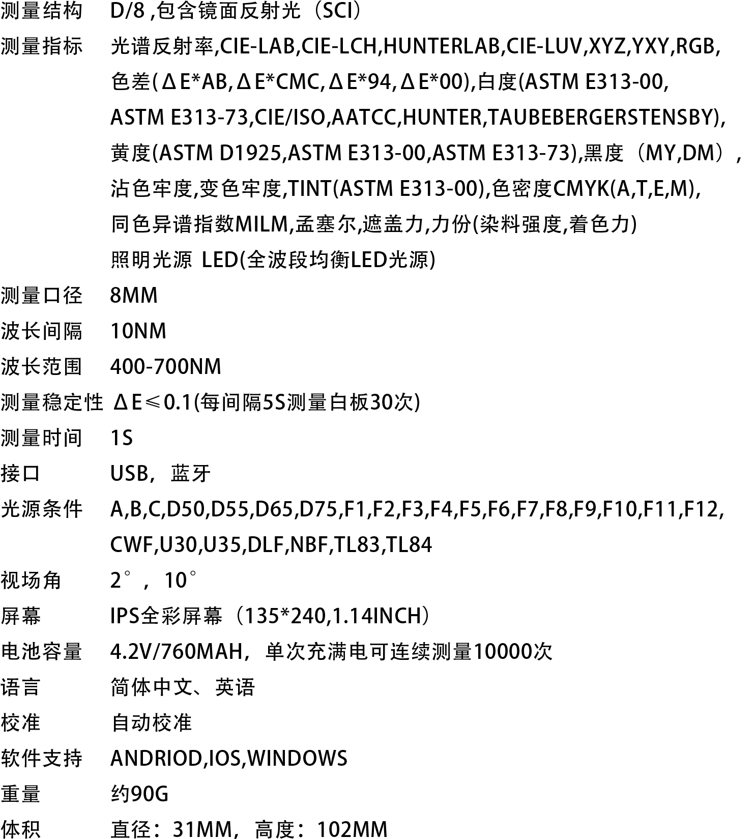 采用國際通用的D/8(積分球漫射照明,8°觀察角),SCI照明觀察條件,測量更準確;